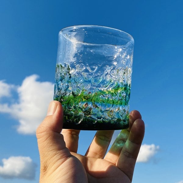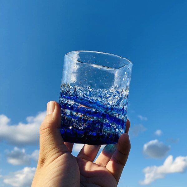商品名:美ら海デコボコグラス カラー:青/緑 材質:ソーダガラス サイズ:[ 高さ:約9.4cm/横幅:約7.7cm/口径:約7.4cm ]